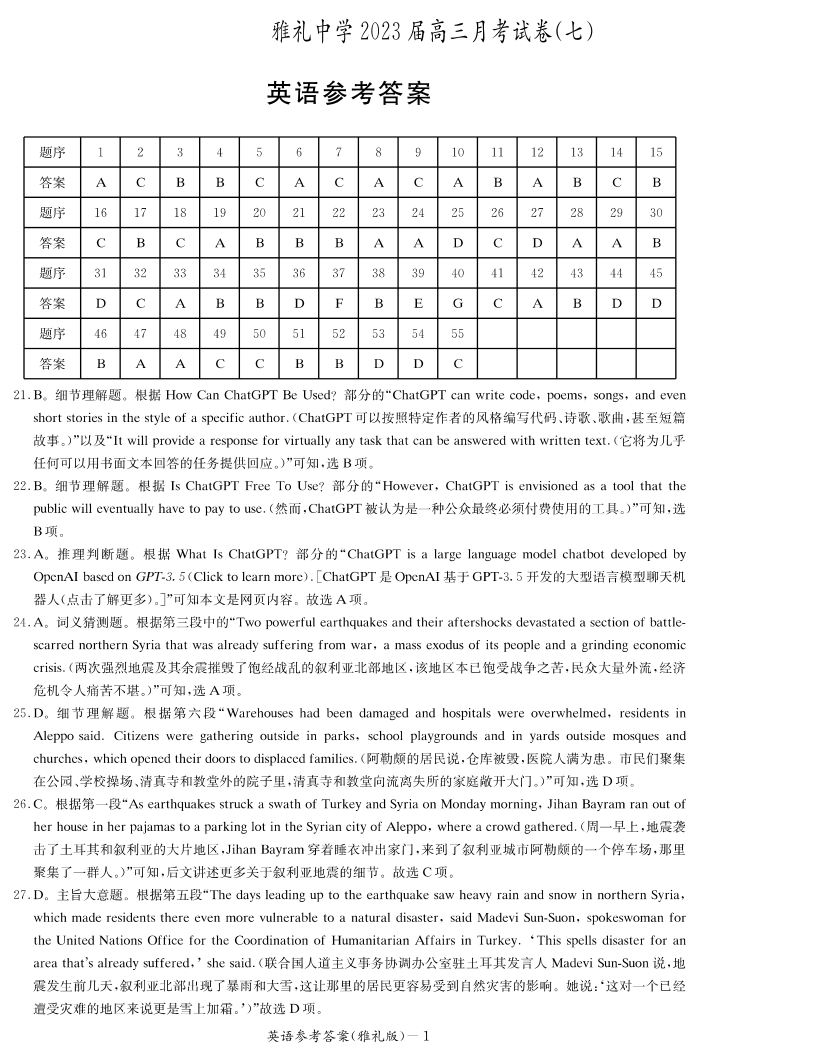 湖南省长沙市雅礼中学2022-2023学年高三下学期月考试卷(七)英语答案