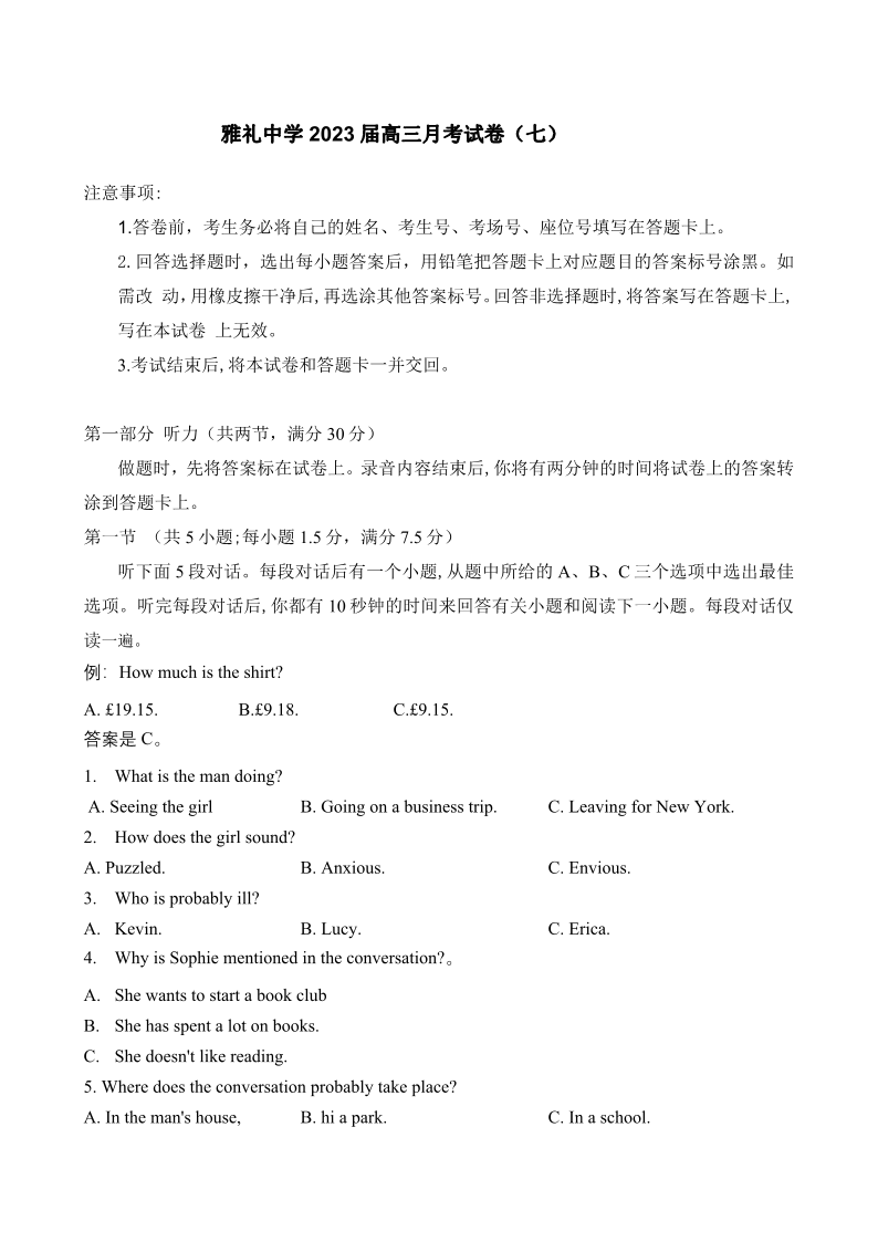 湖南省长沙市雅礼中学2022-2023学年高三下学期月考试卷(七)英语试题