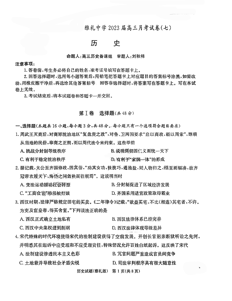 湖南省长沙市雅礼中学2022-2023学年高三下学期月考试卷(七)历史试题