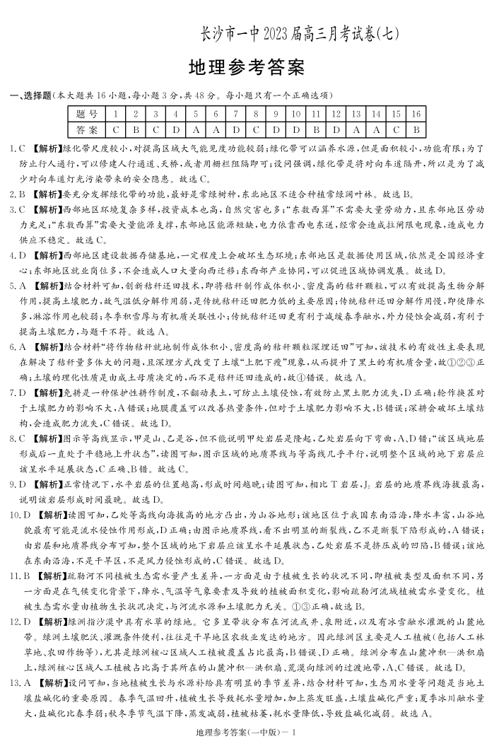 湖南省长沙市第一中学2023届高三月考卷(七)丨地理答案