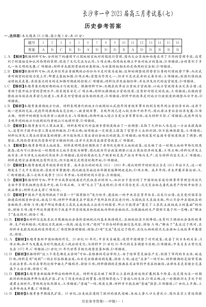 湖南省长沙市第一中学2023届高三月考卷(七)丨历史答案