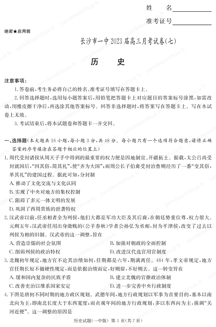 湖南省长沙市第一中学2023届高三月考卷(七)丨历史