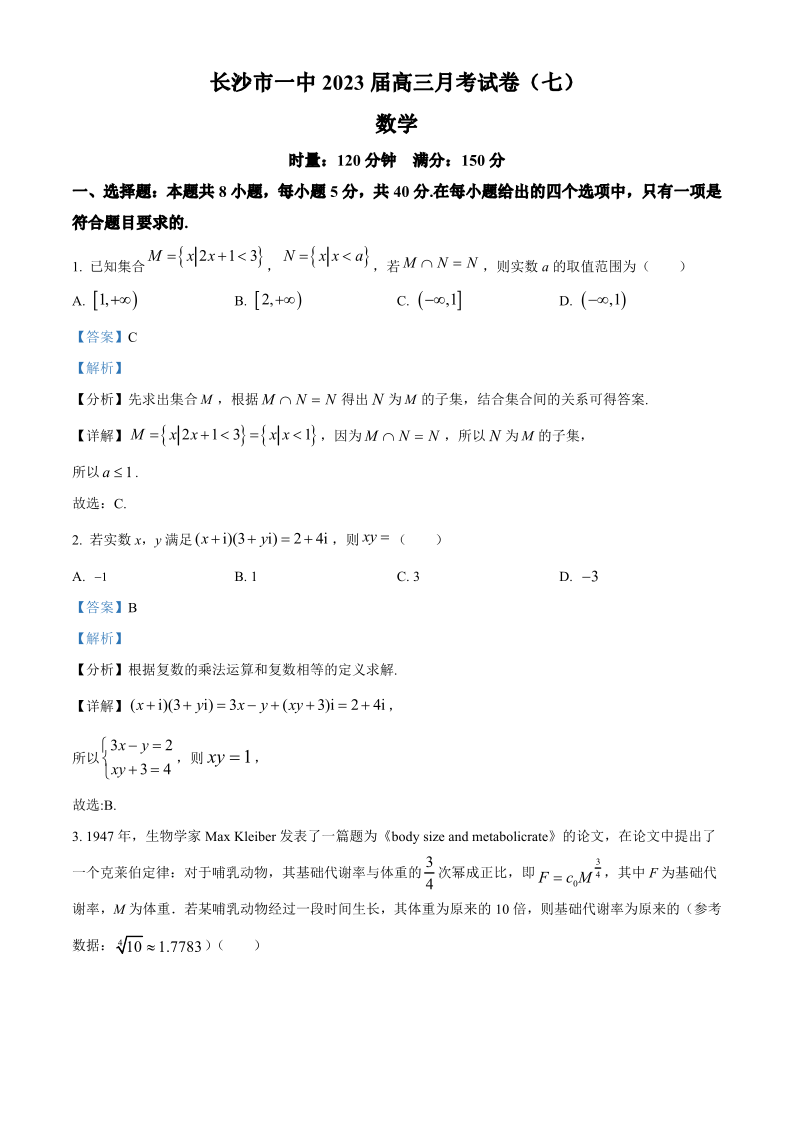 湖南省长沙市第一中学2023届高三月考卷(七)丨数学答案