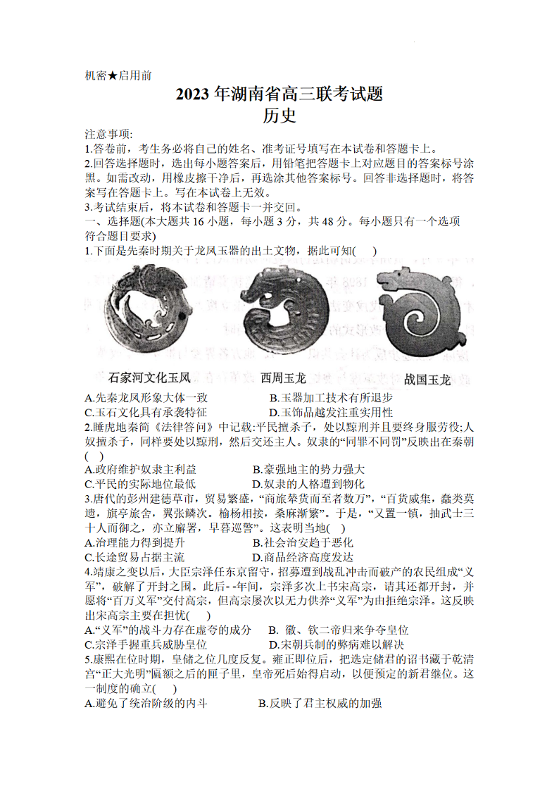 湖南省衡阳市2023届高三第二次联考(二模)历史