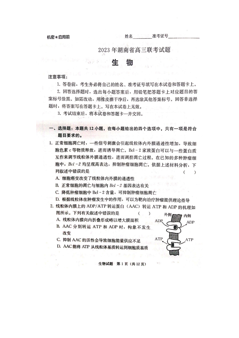 湖南省衡阳市2023届高三第二次联考(二模)生物