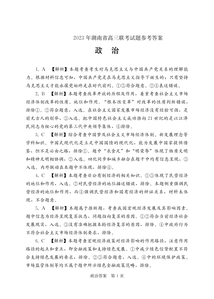 湖南省衡阳市2023届高三第二次联考(二模)政治答案