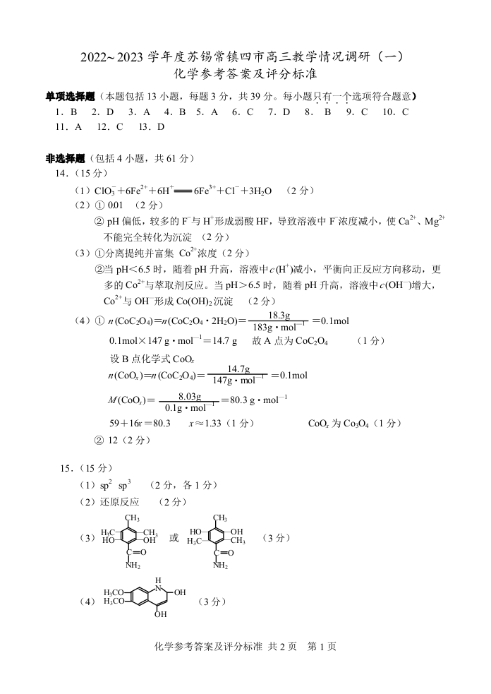 2023届江苏省苏锡常镇四市高三下学期教学情况调研(一)化学答案