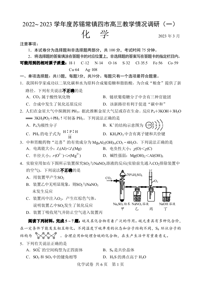 2023届江苏省苏锡常镇四市高三下学期教学情况调研(一)化学