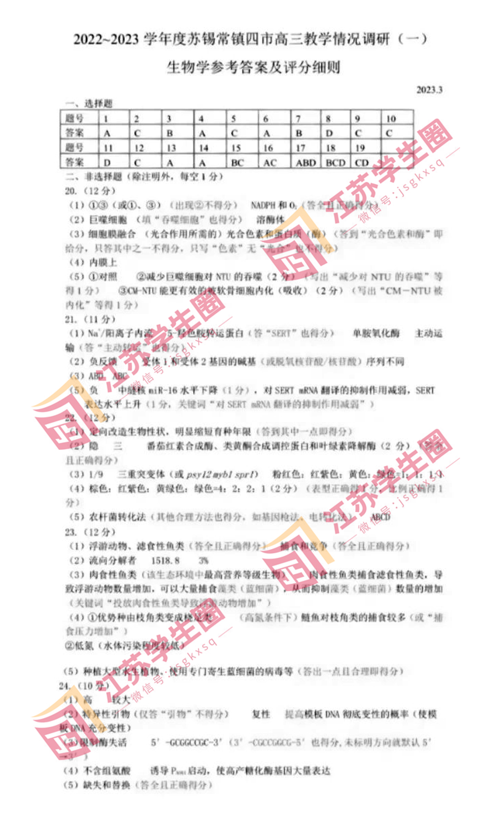 2023届江苏省苏锡常镇四市高三下学期教学情况调研(一)生物答案