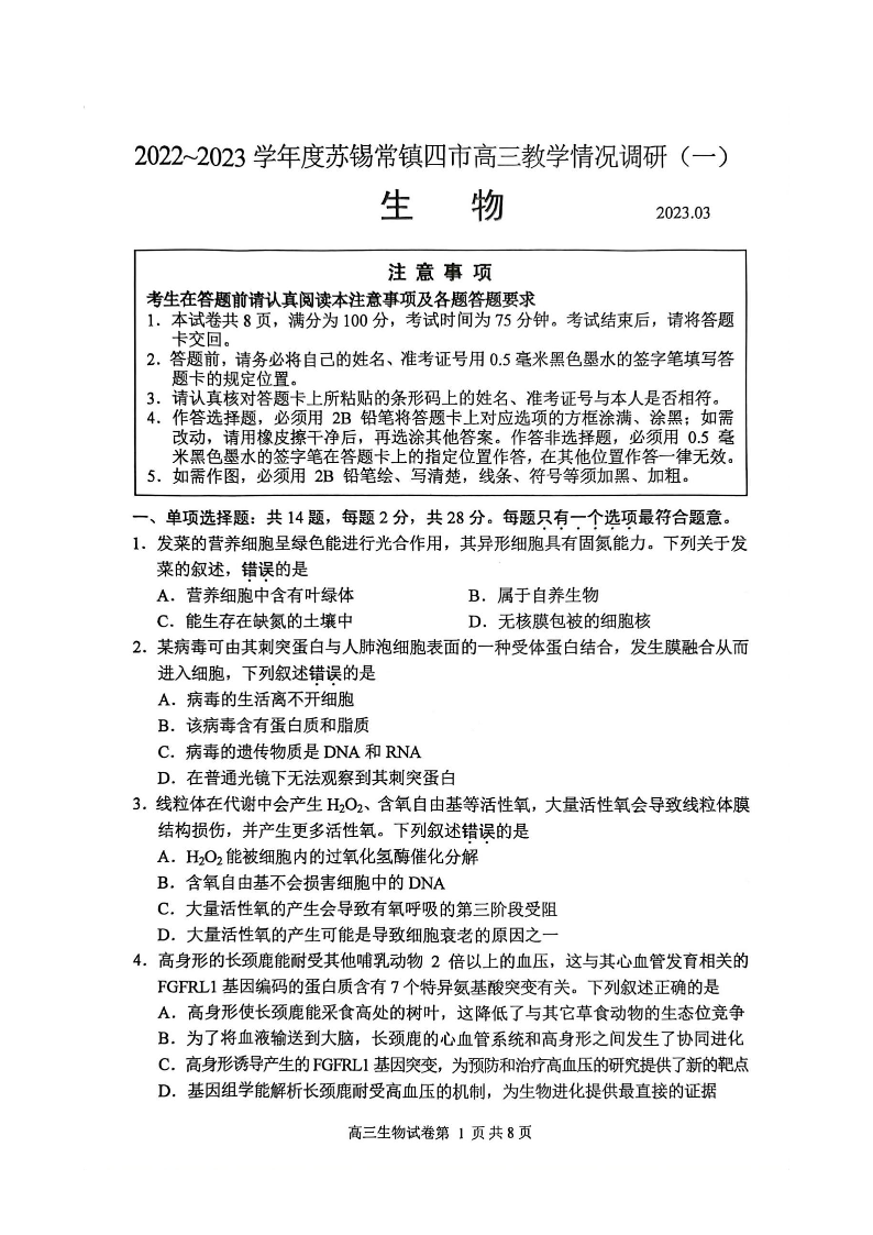2023届江苏省苏锡常镇四市高三下学期教学情况调研(一)生物