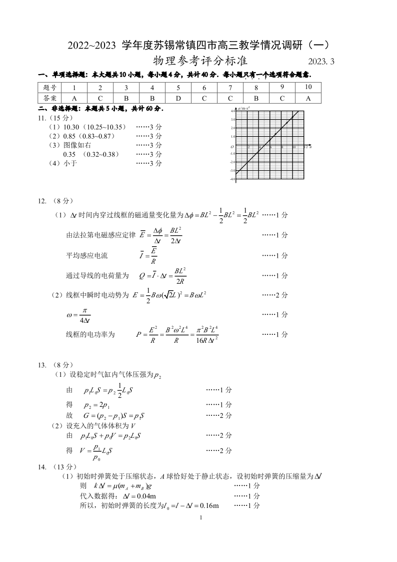 2023届江苏省苏锡常镇四市高三下学期教学情况调研(一)物理答案