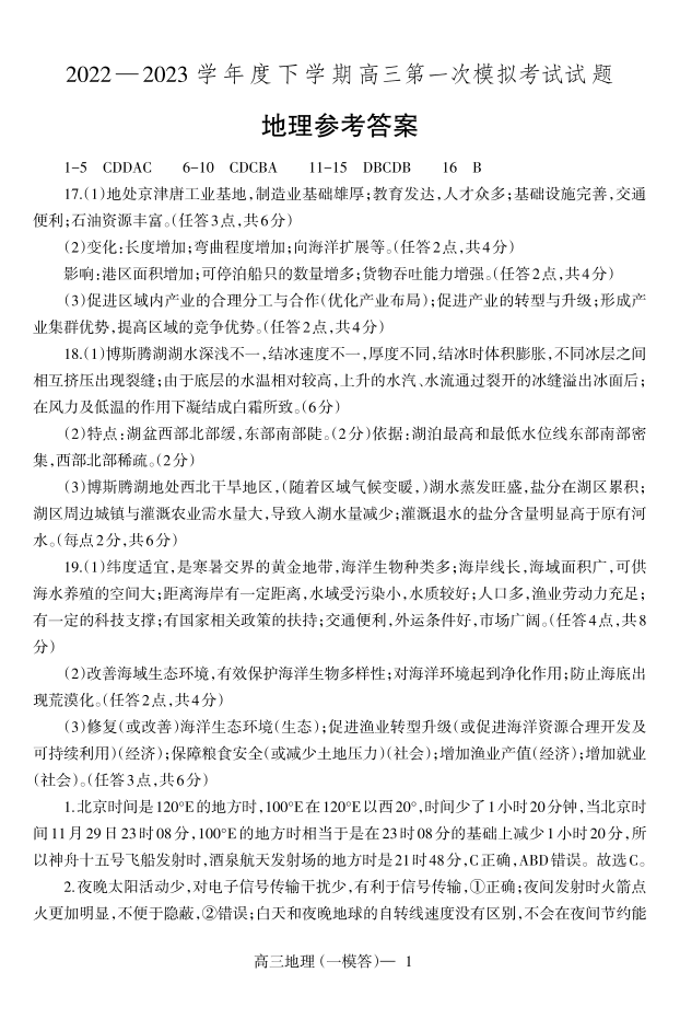 2023届辽宁省协作校高三下学期第一次模拟考试一模高三地理答案
