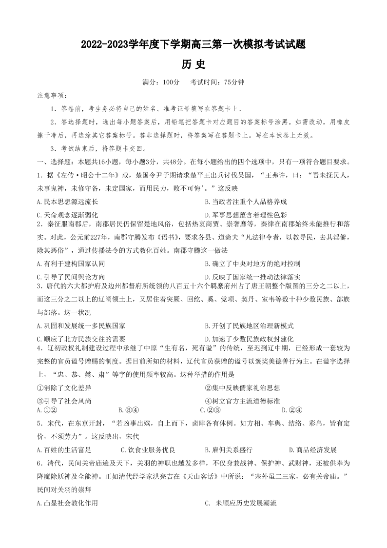 2023届辽宁省协作校高三下学期第一次模拟考试历史试题