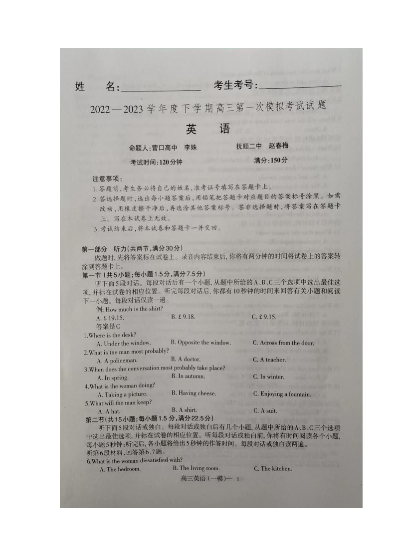 2023届辽宁省协作校高三下学期第一次模拟考试英语试题