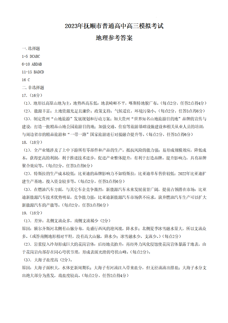 2023届辽宁省抚顺市普通高中第一次模拟考试 地理答案