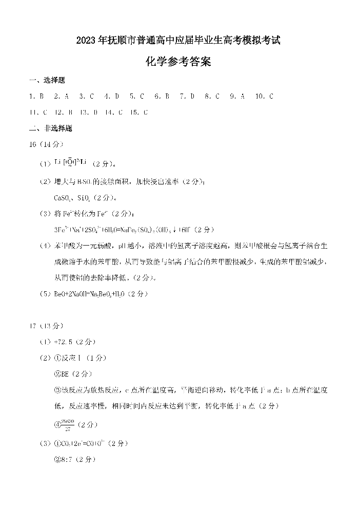 2023届辽宁省抚顺市普通高中第一次模拟考试 化学答案