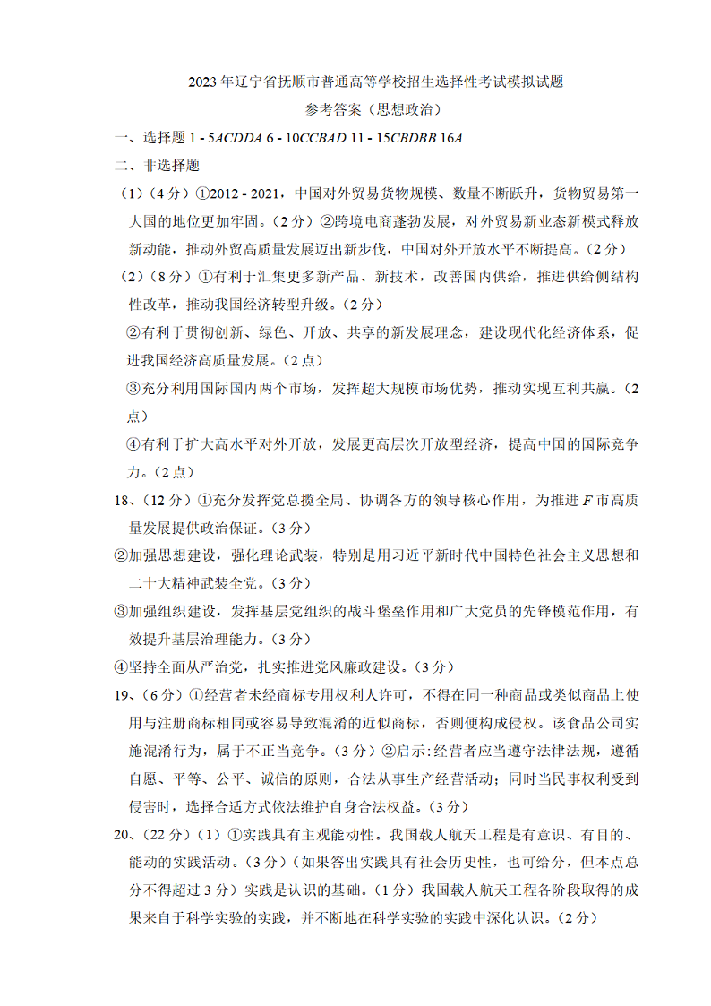 2023届辽宁省抚顺市普通高中第一次模拟考试 政治答案