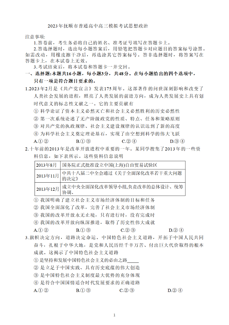 2023届辽宁省抚顺市普通高中第一次模拟考试 政治