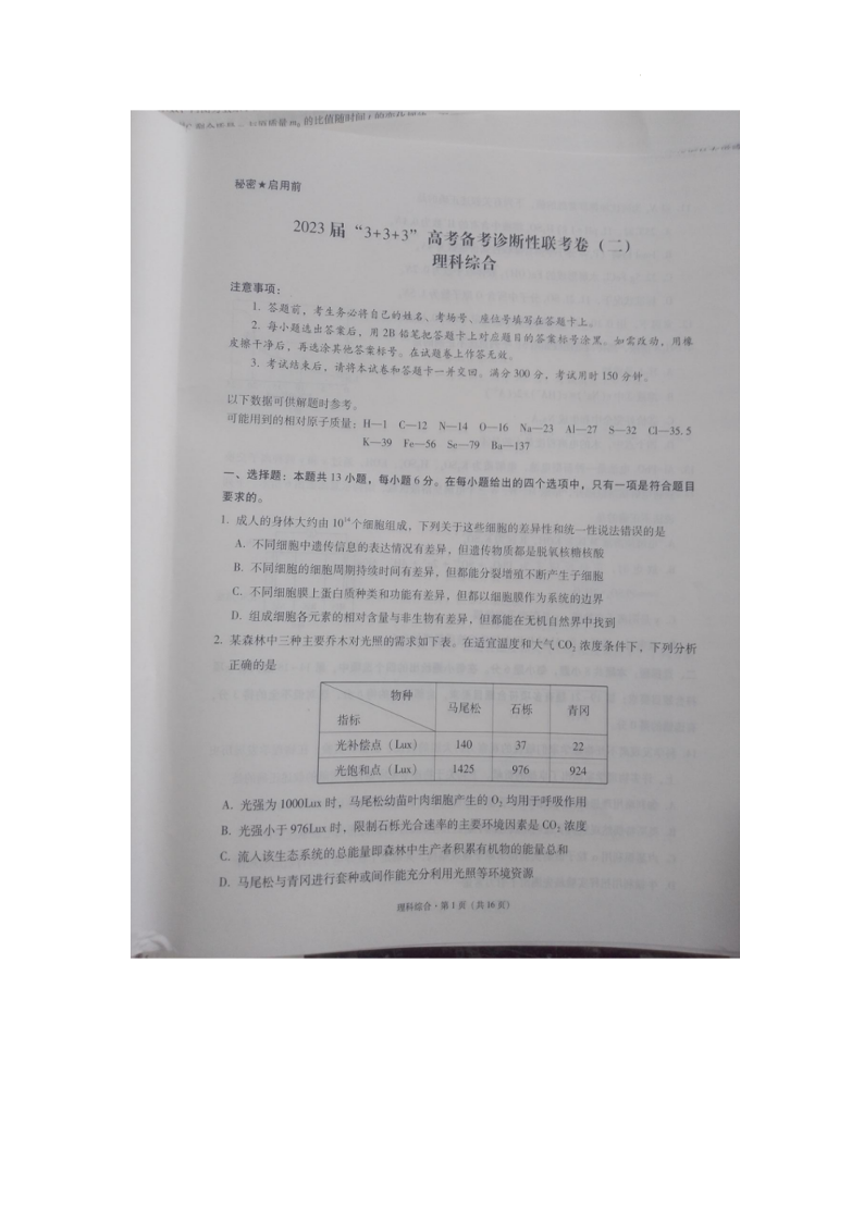 2023届“3+3+3”高考备考诊断性联考卷(二)理综