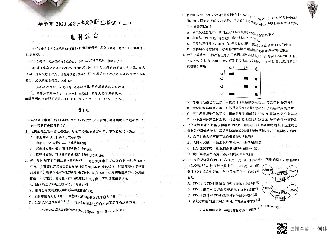 2023届贵州省毕节市高三第二次诊断性考试 理科综合