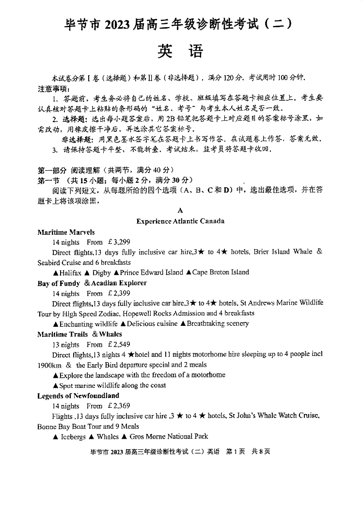2023届贵州省毕节市高三第二次诊断性考试 英语