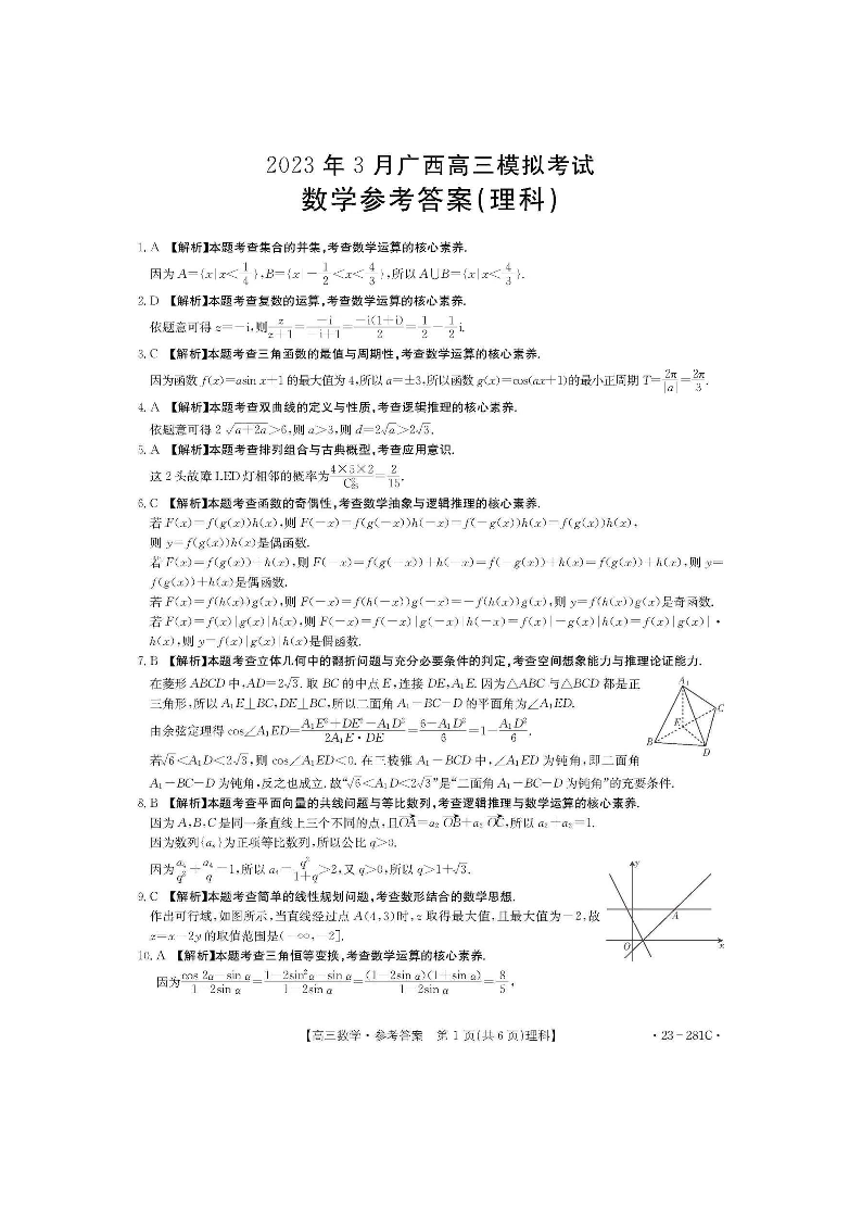 广西梧州市2023年3月高三模拟考试(梧州二模)理数试题答案