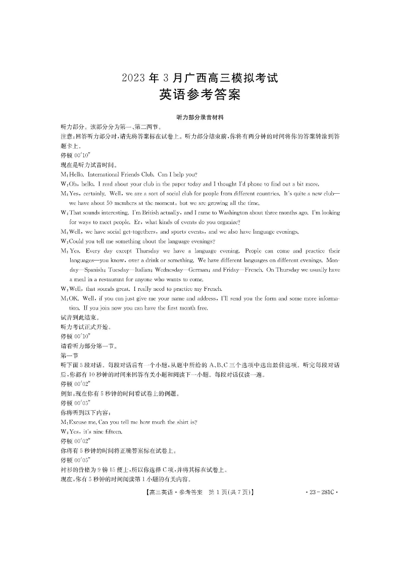 广西梧州市2023年3月高三模拟考试(梧州二模)英语试题答案