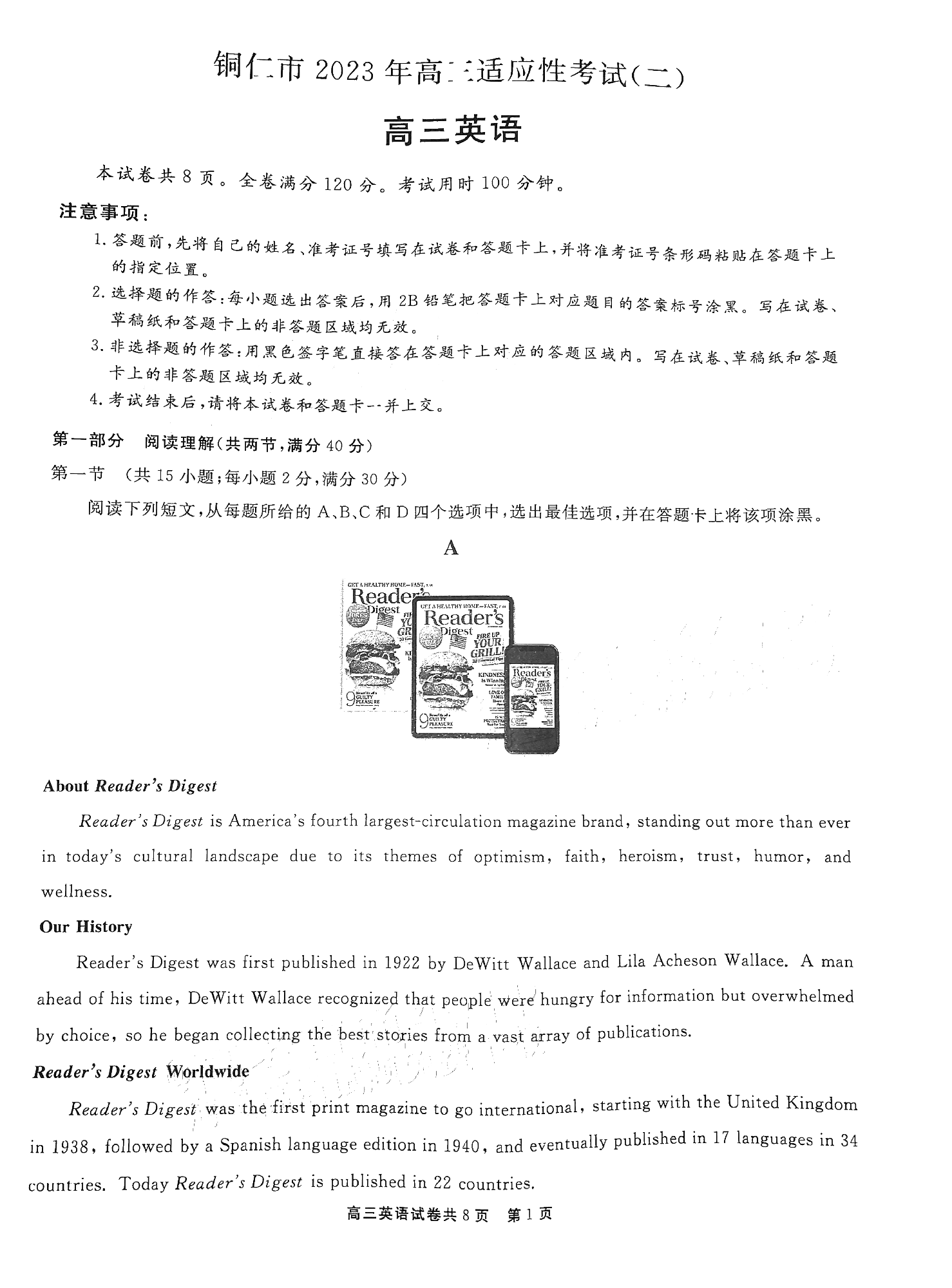 贵州省铜仁市2023届高三适应性考试(二)丨英语