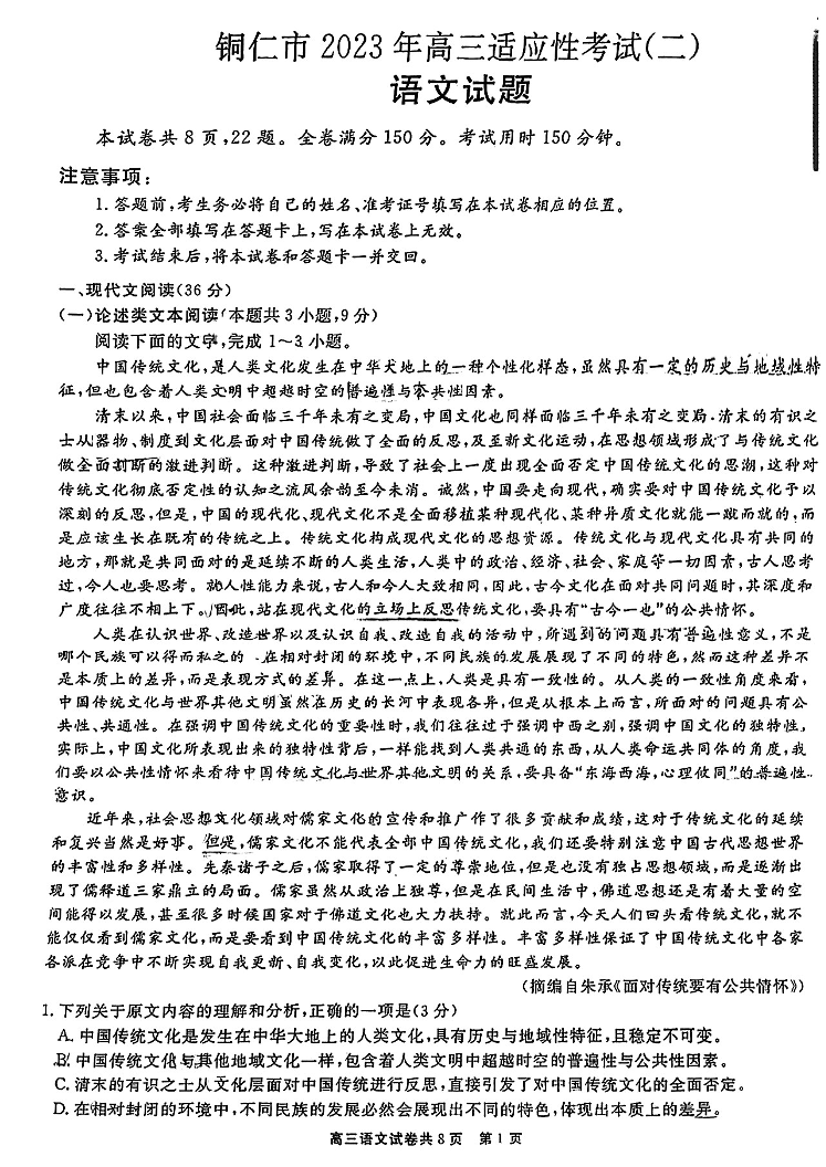 贵州省铜仁市2023届高三适应性考试(二)丨语文
