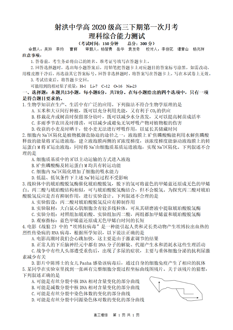 四川省射洪中学2022-2023学年高三下学期3月第一次月考 理综