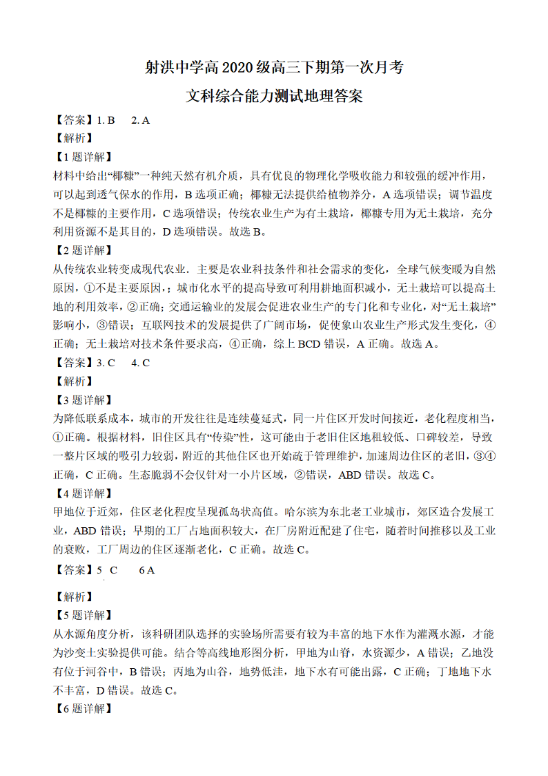 四川省射洪中学2022-2023学年高三下学期3月第一次月考 文综地理答案