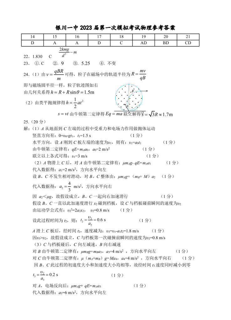 宁夏回族自治区银川一中2023届高三第一次模拟考试丨理综物理答案