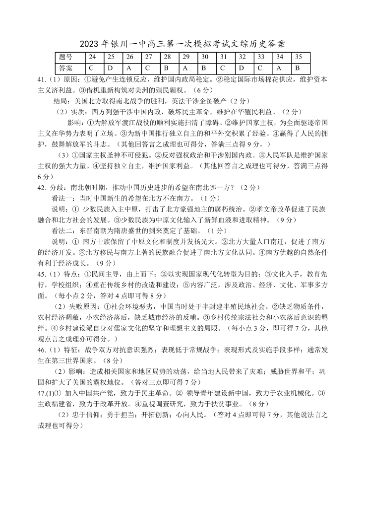 宁夏回族自治区银川一中2023届高三第一次模拟考试丨文综历史答案