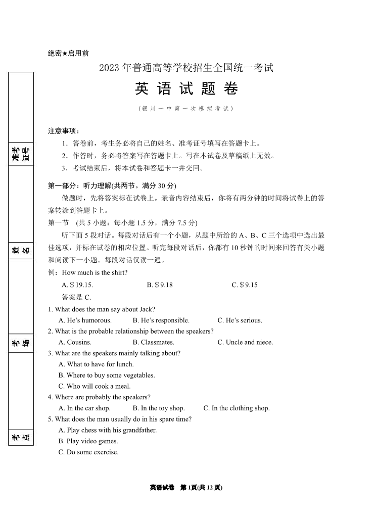 宁夏回族自治区银川一中2023届高三第一次模拟考试丨英语