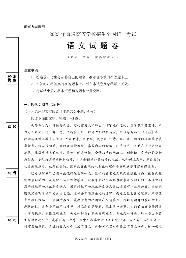 宁夏回族自治区银川一中2023届高三第一次模拟考试丨语文