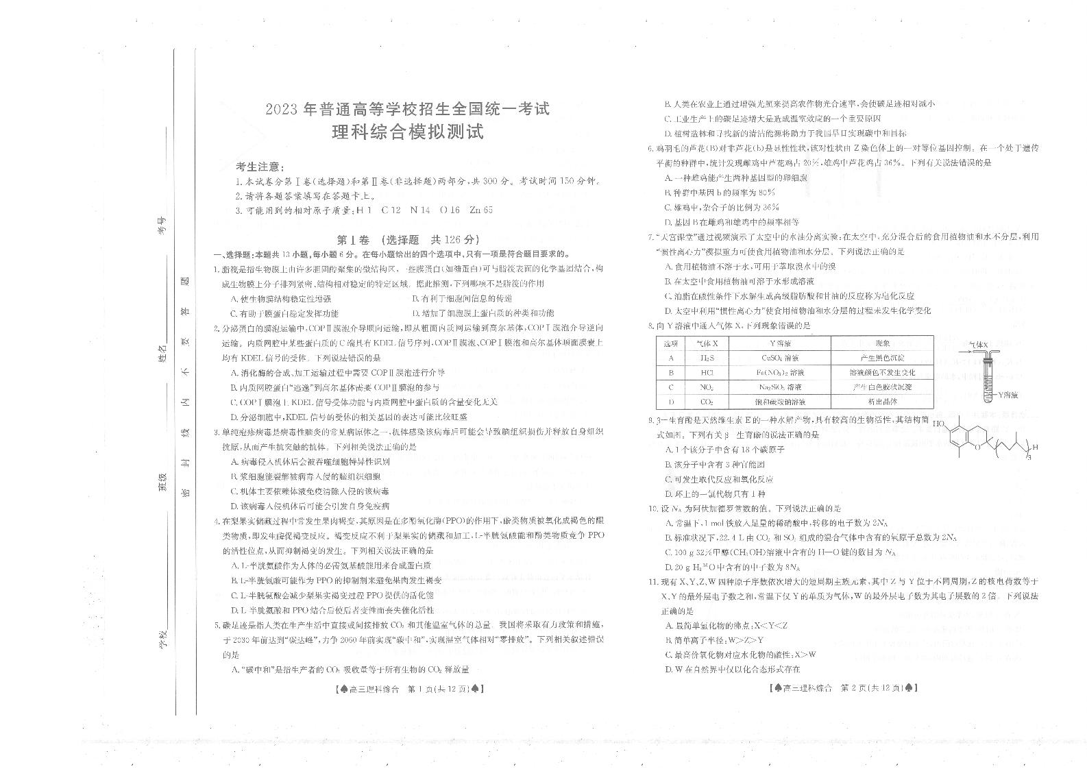 2023届陕西省部分名校高考仿真模拟测试 理综