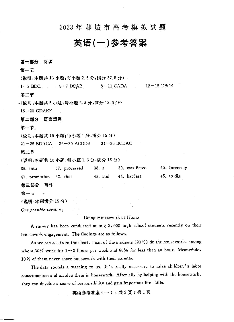 山东省聊城市2023届高三下学期第一次高考模拟考试 英语答案