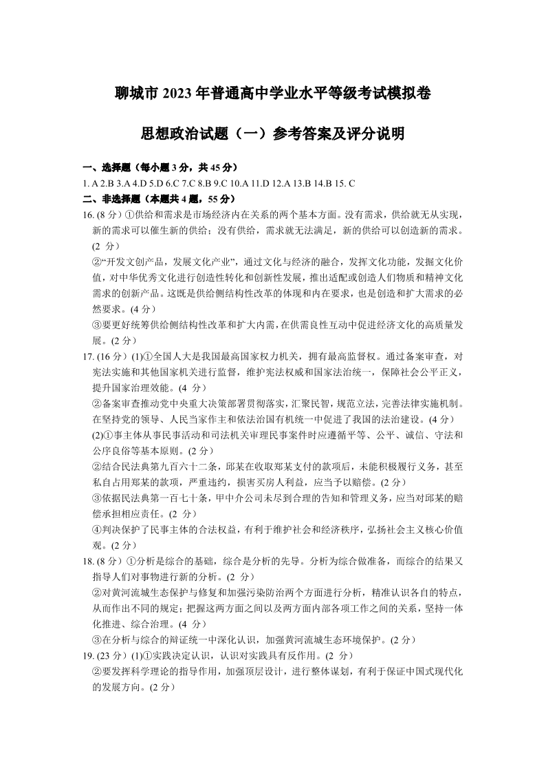 山东省聊城市2023届高三下学期第一次高考模拟考试 政治答案