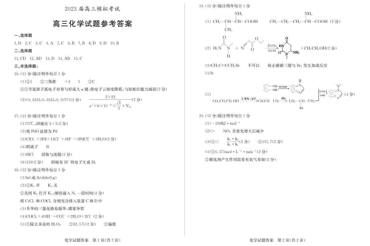 2023届山东省枣庄市高三(二模)丨化学答案