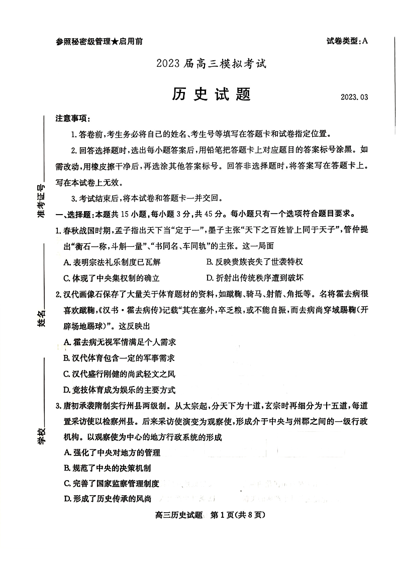 2023届山东省枣庄市高三(二模)丨历史