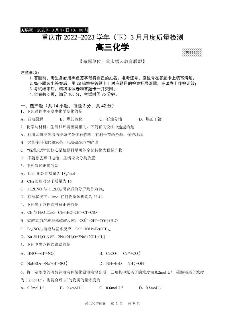 重庆市缙云教育联盟2022-2023学年高三下学期3月月考 化学