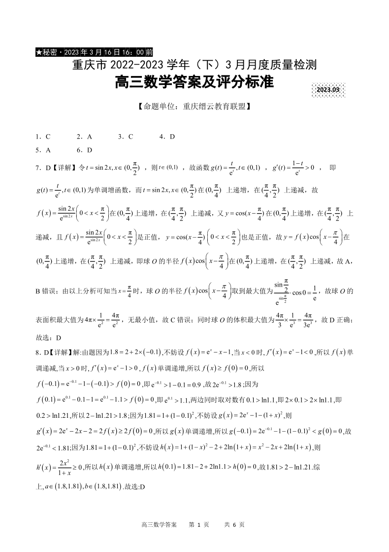 重庆市缙云教育联盟2022-2023学年高三下学期3月月考 数学答案