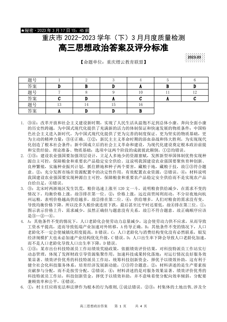 重庆市缙云教育联盟2022-2023学年高三下学期3月月考 政治答案