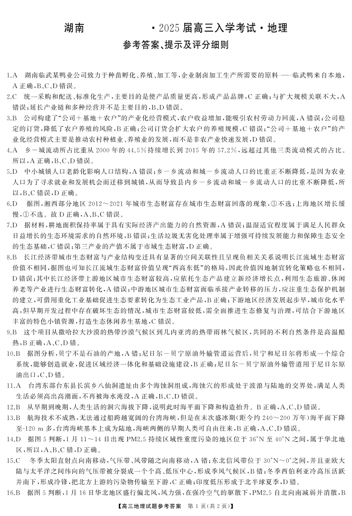 湖南省湖南天壹名校联盟2025届高三8月入学联考考试 地理答案