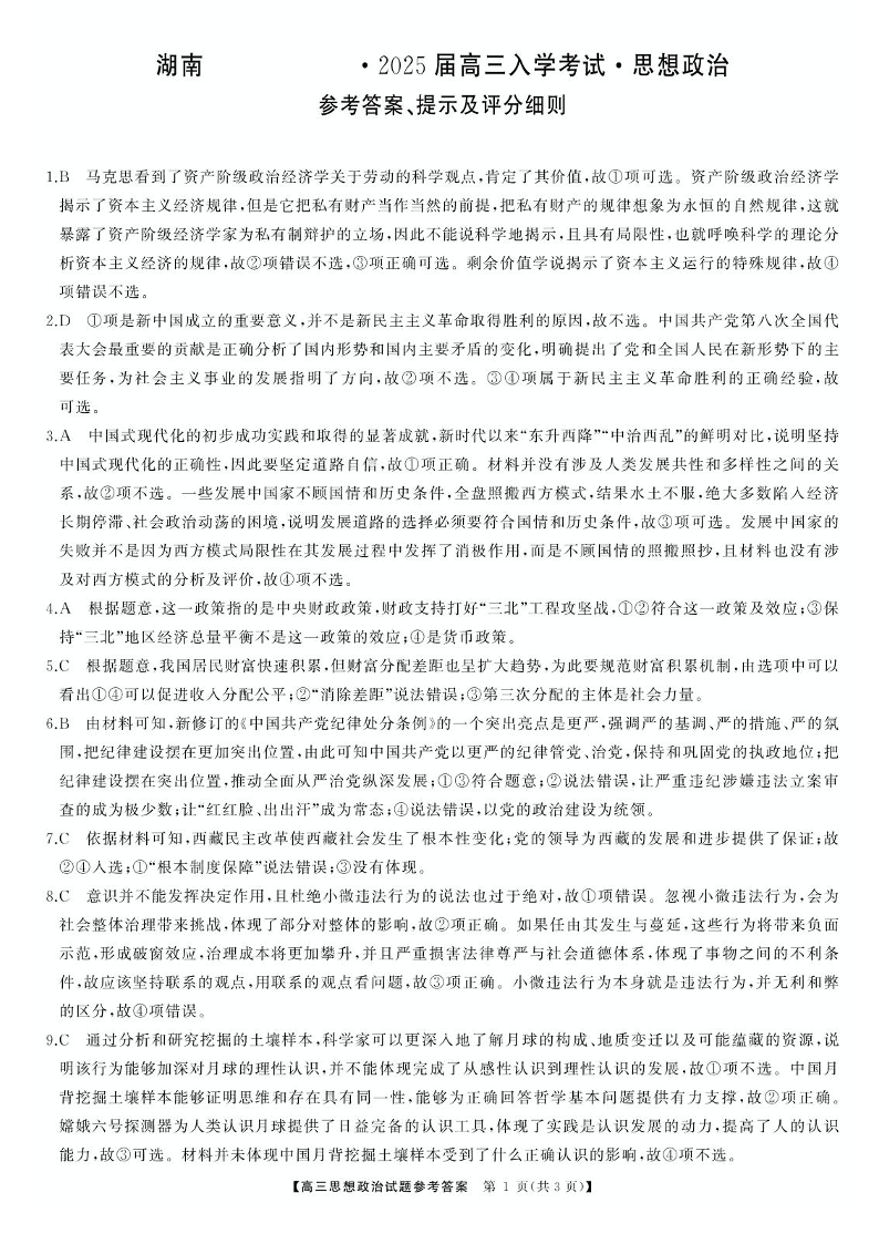 湖南省湖南天壹名校联盟2025届高三8月入学联考考试 政治答案