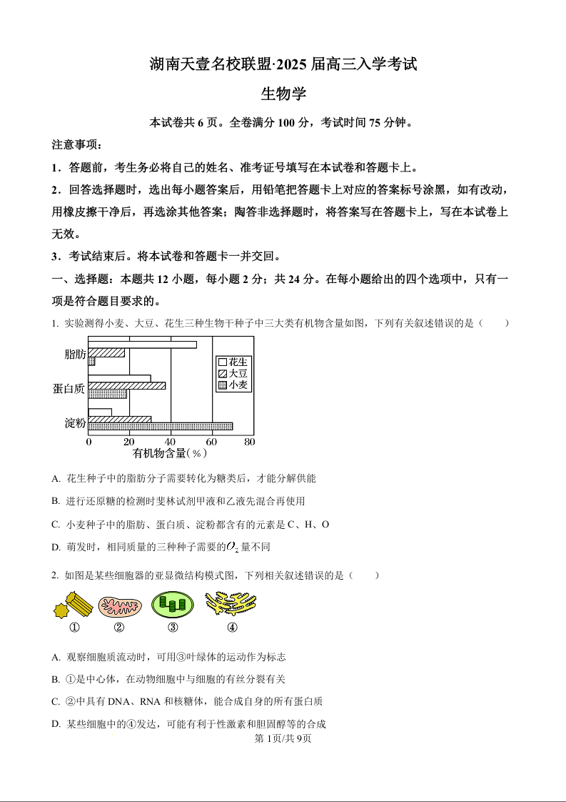 湖南省湖南天壹名校联盟2025届高三8月入学联考考试 生物