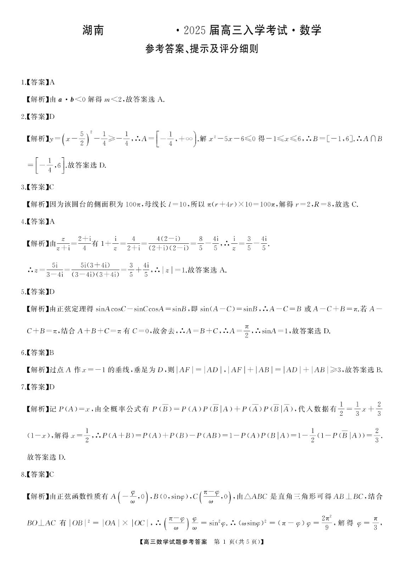 湖南省湖南天壹名校联盟2025届高三8月入学联考考试 数学答案