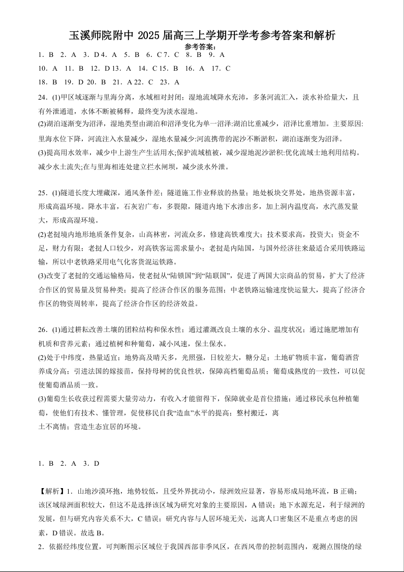 云南省玉溪师范学院附属中学2024-2025学年高三上学期开学检测 地理答案