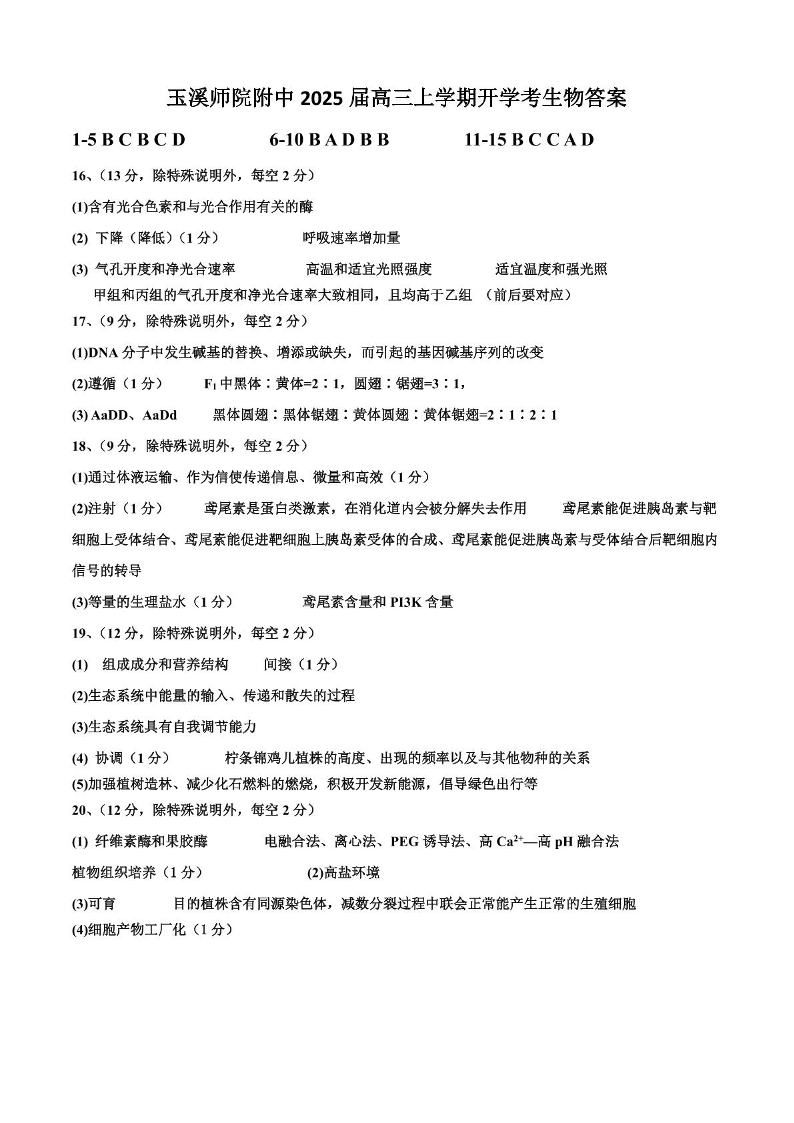 云南省玉溪师范学院附属中学2024-2025学年高三上学期开学检测 生物答案