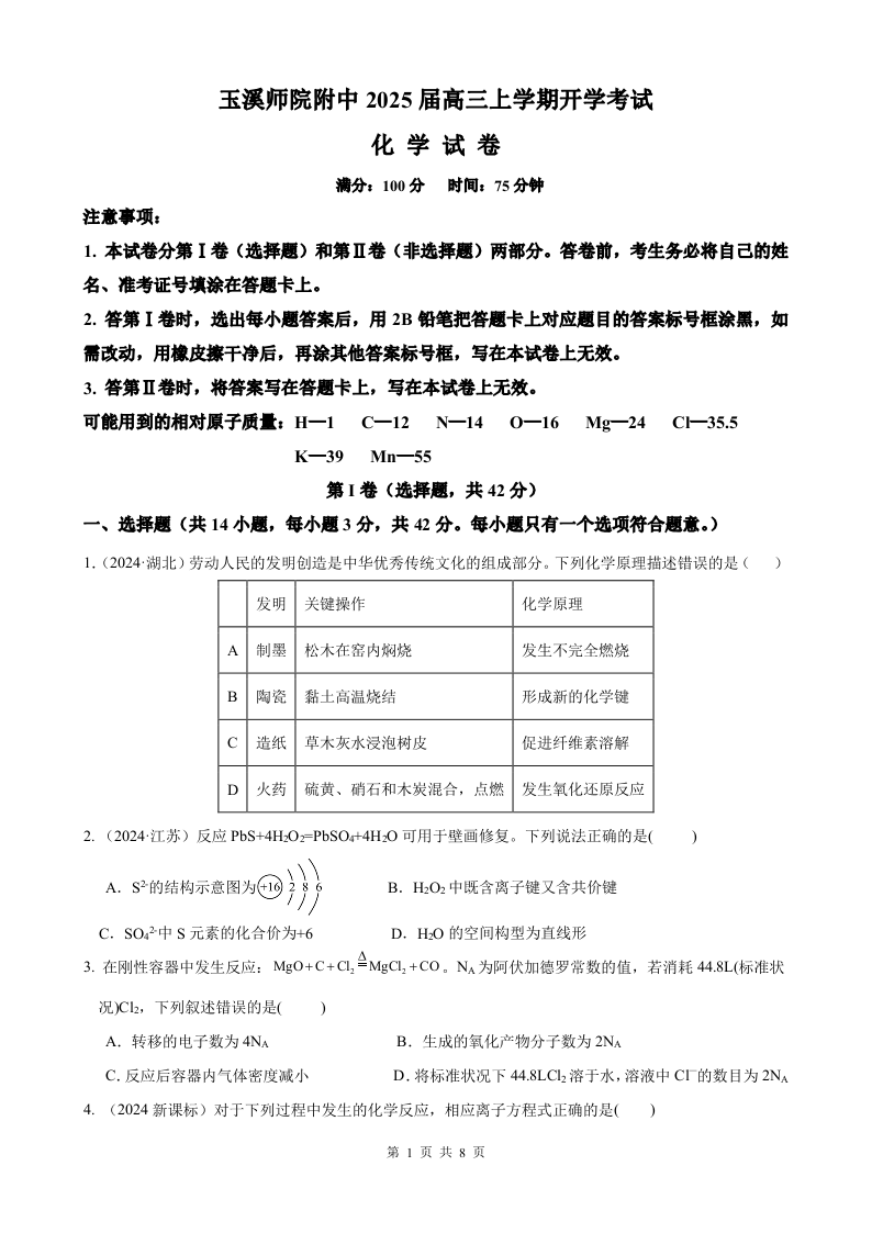 云南省玉溪师范学院附属中学2024-2025学年高三上学期开学检测 化学